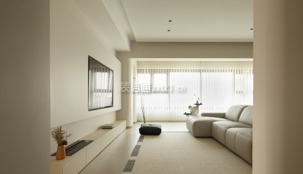2、客厅装修:干净透彻的颜色,利落舒爽的线条是客厅给人最深刻的印象,素雅白构建了纯洁的基调,少量棕色装饰和黑色线条点缀其中,增添活跃之感。无主灯设计为顶部空间减少赘饰,悬浮吊顶增加纵向延伸感。从进门到阳台,6.5m长的距离几乎全做了储物柜设计,仅在中间部分打造了一个展示格,用绿植打造出中线端景。“l”型镂空让靠近阳台一侧的柜体悬空,部分木格栅造型柜门、开放式展示柜穿插其中,避免了全是柜门带来的沉闷。5.3m长的景观阳台尽数纳入客厅,为了让更多自然光进入家居空间,客厅的窗帘选用了轻薄的白纱梦幻帘,光倾洒入客厅,没有墙体的阻碍,随着空间的延展在家中蔓延。翻一本好书,看一场电影,与家人靠在软牛皮沙发上,或是就着柔软的地毯席地而坐,享受温柔平静的亲子时光。悬浮电视背景墙将电视完美内嵌,插座、网络接入口、机顶盒等物件巧妙纳入下方的地台柜中。从侧面看无凸出部分,没有杂乱的电线露出,高级感满满。乳白色定制地台柜代替了传统的电视柜,加装的雾化壁炉可以在冬日里为这个清冷的空间增添一丝暖意,橘红色的壁炉灯光与嵌在电视背景墙边缘的暖色灯带交织成落日余晖的画卷。既是为了包裹阳台落水管,也是为了弱化上方梁的存在感、增添柔和之意,阳台的展示柜的圆弧造型延伸至梁的位置,吊顶也采用了立面弧形吊顶。木作弧形造型预留凹槽,形成独特的内龛造型展示柜,三层褐色的隔板可以放些精致摆件,也与进门整墙储物柜开放格的隔板材质一样,点对点的呼应让整体氛围更为和谐。家政间仅做了拱形门洞,开放式的格局增添过道的通透感,这种自由的呼吸感自客厅发散到其他几个空间。一侧墙面用倒立拱形的棕色壁画打破大白墙的沉寂,在造型上和门洞相呼应,趣味十足。