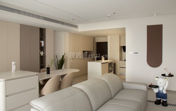 3、餐厅装修:ldk一体化设计打破常规,让客、餐、厨三个空间融为一体,奶白色铺满整个大空间,利落齐平的线条展现规整感的同时形成了过道,区分不同的功能区。从广东定制的餐岛一体式餐桌造型独特,用料讲究。轨道插座增加了生活的便利性,卫生程度也比地插高。圆弧的餐桌边角线条、实木台面的温润质感中和了阳角和储物柜体的凌厉。上方轨道射灯和筒灯作为餐厅的光源,灯光效果可调节,下方鹅卵石点缀在悬空柜体之下,就餐氛围轻松拿捏。