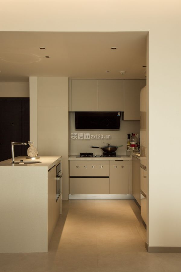 4、厨房装修:厨房虽小但胜在整洁,墙体拆除后增设了岛台,既起到了分隔作用,还作为橱柜的补充,增加了厨房的储物空间。白色台面与操作台台面一致,空间整体感强。