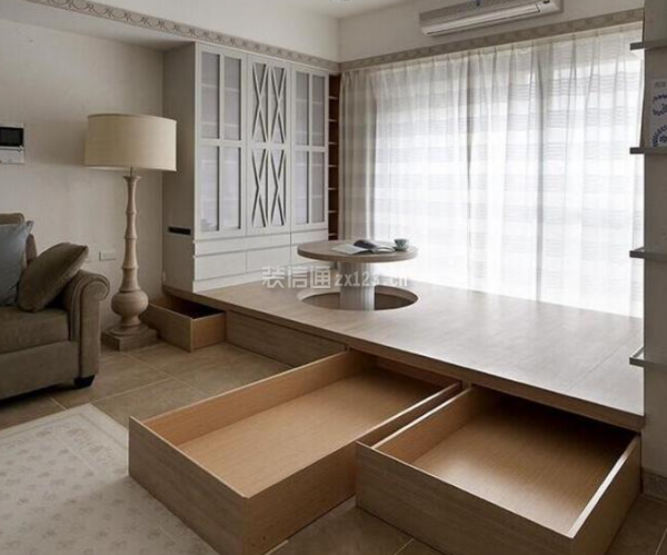 客厅阳台改卧室,利用榻榻米是最佳选择。客厅阳台改卧室效果图中的榻榻米属于升降式榻榻米。现在市面上有很多可以升降的榻榻米床,小桌子不用时可以降下放平,铺上垫子就可以作为卧室,这是有客人来的时候解决住宿问题的好办法。在平时的生活中,我们可以将桌子升起,在这里喝喝茶、看看书,享受一个人的安静时光。