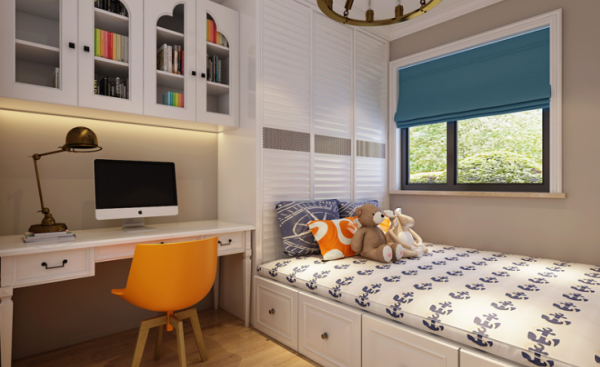 即使是利用了房间边角,但是也应尤为注意照明度和采光,比方说将工作台放在阳光充裕但不直射的窗边,电脑屏幕反光问题就解决了,同时在工作疲惫时还可凭窗远眺,另外在书房内一定要设有台灯和书柜射灯,以便主人阅读和查找书籍。